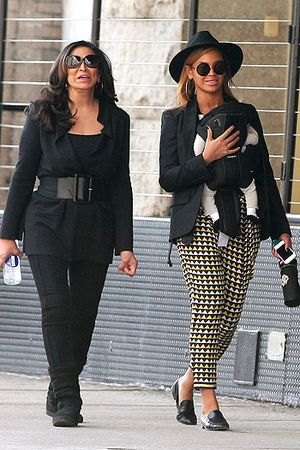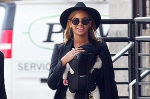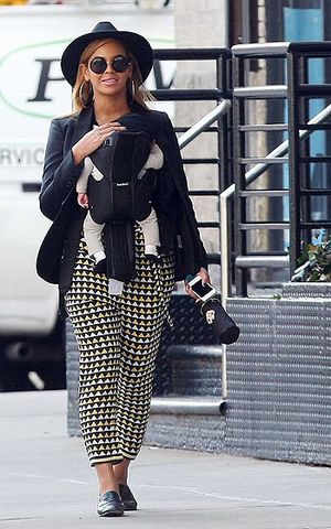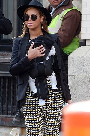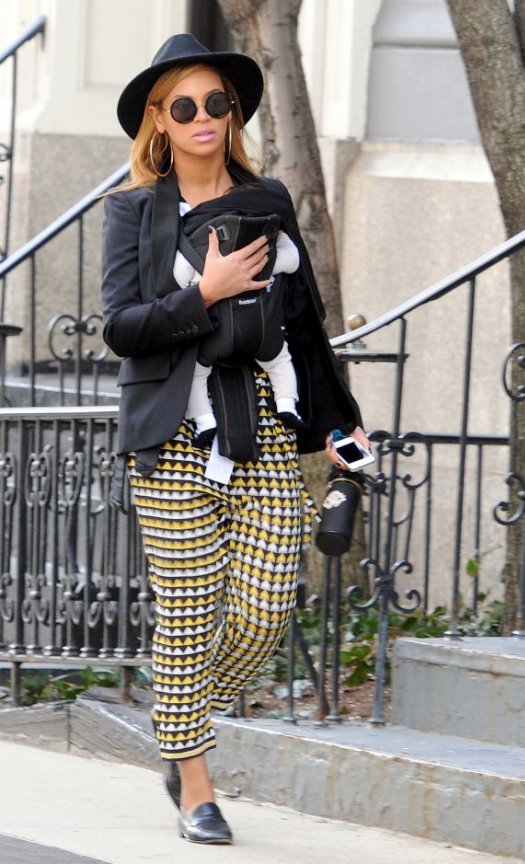 Співачка одягла на цей раз чорний жакет, прінтовані штани і капелюха. Свої ноги Бейонсе загорнула для прогулянки в зручні шкіряні лофери. На додаток до одягу зірка прикрасила себе величезними сережками-кільцями, а очі сховала за круглі окуляри. Свою донечку поп-діва несла в спеціальній сумці-колисці «кенгуру».